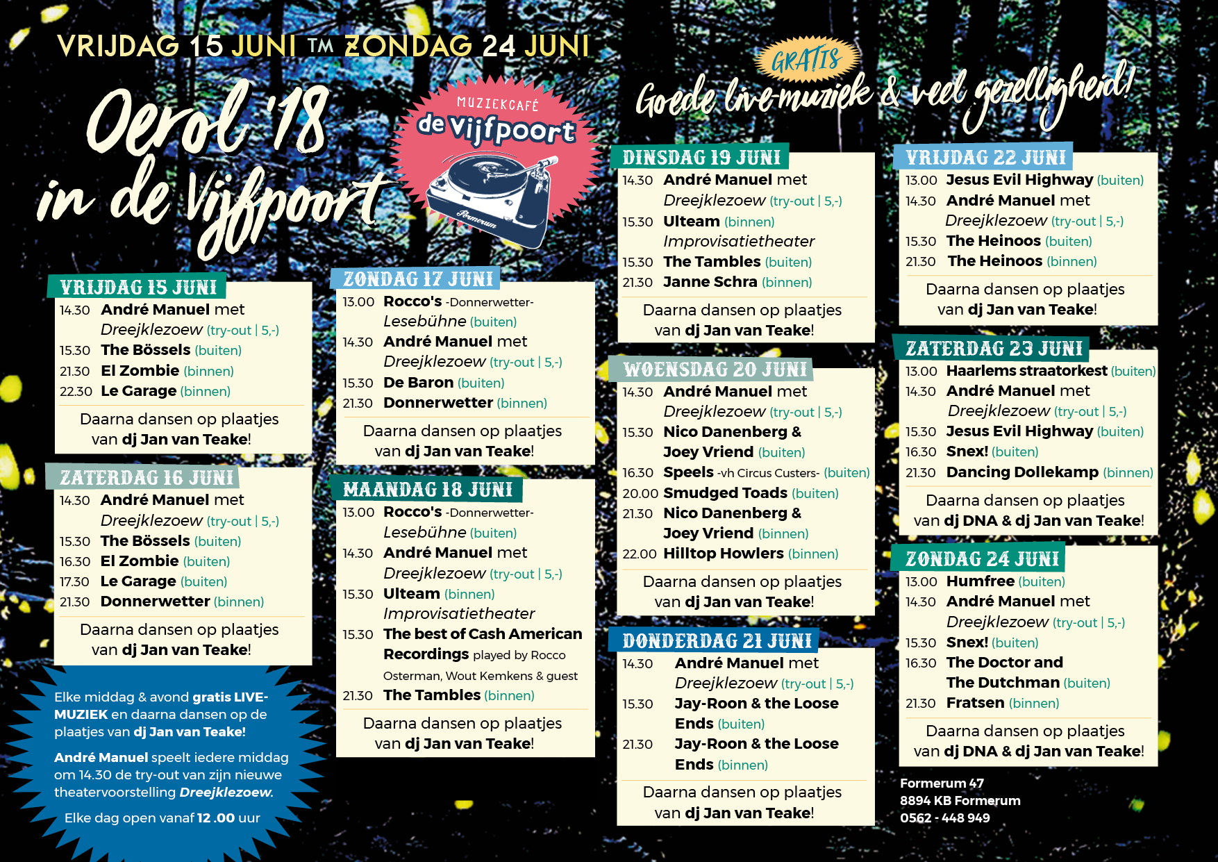 De Vijfpoort heeft een afwisselend aanbod van bands door het hele jaar. Bekijk ons programma en kies wat u mooi vindt!